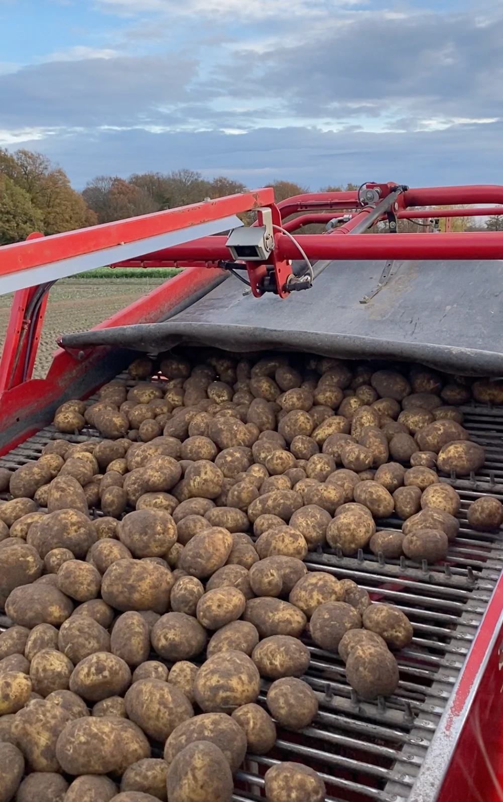 Frische und Qualität der Rohware stehen für Schne-frost im Vordergrund. Die Landwirtschaftsbetriebe und Erzeugergenossenschaften, mit denen sie zusammenarbeiten, liegen in einem Umkreis von 100 Kilometern zum Unternehmensstandort. Dort, im Südoldenburger Land, befindet sich das größte Kartoffelanbaugebiet Deutschlands. Die vorab festgelegten Kontraktpreise sind die Grundlage für eine faire Geschäftsbeziehung zwischen Schne-frost und den Betrieben. Jeden Tag erreichen Schne-frost 20 bis 25 Lkw bzw. Traktoren mit frisch geernteten Kartoffeln beladen. Daraus ergibt sich ein Jahresbedarf von etwa 100.000 Tonnen Kartoffeln. Bei guten Erntebedingungen in der Saison reichen die eingelagerten Kartoffeln bis zur Ernte im nächsten Jahr. Ist dies nicht der Fall, werden Kartoffeln aus dem Rheinland zugekauft. Die Lagerung der Kartoffeln übernehmen die Landwirt*innen. Diese ist besonders anspruchsvoll, da eine schlechte Kartoffel schnell 15 weitere anstecken kann.